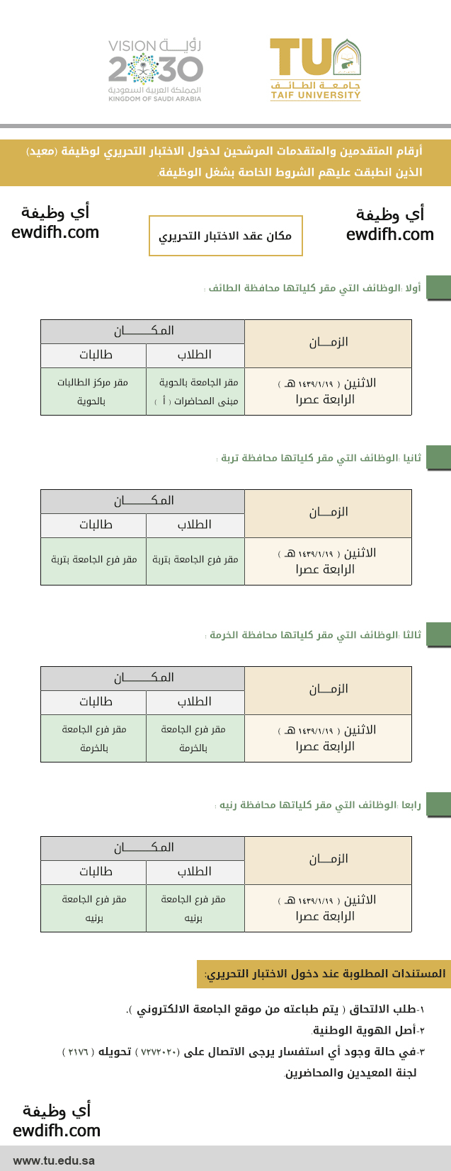 أعلنت جامعة الطائف عبر موقعها الإلكتروني عن أرقام المتقدمين والمتقدمات الذين تم ترشيحهم لدخول الاختبار التحريري لوظيفة (معيد)، وذلك ضمن الشروط المحددة لشغل هذه الوظيفة، والتي تم الإعلان عنها سابقًا من خلال موقع الجامعة وموقع (أي وظيفة) تحت الخبر رقم (47730).