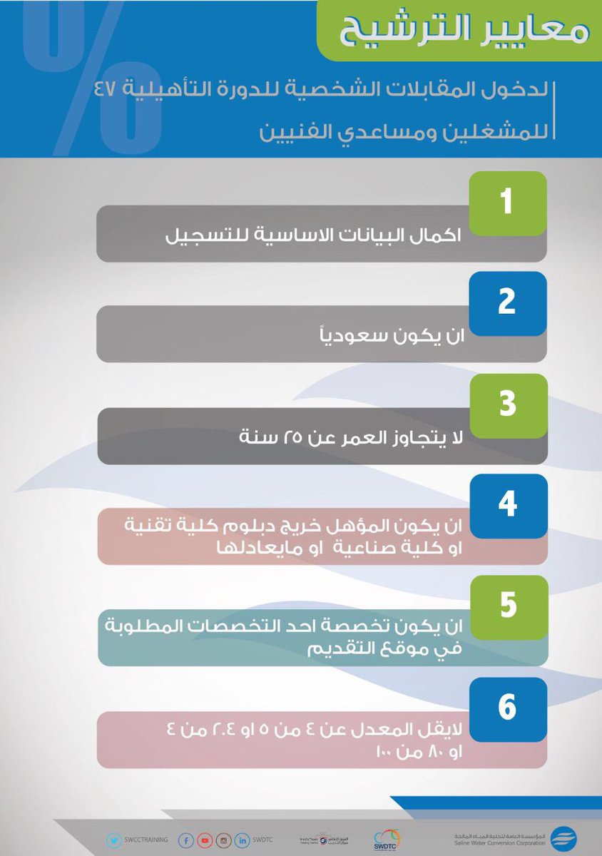 أعلنت المؤسسة العامة لتحلية المياه المالحة عن نتائج القبول للدورة التأهيلية 47، وذلك بعد استكمال فترة التقديم التي شهدت إقبالاً كبيراً بلغ عدد المتقدمين فيها 10,966 متقدماً، وذلك وفقاً لمعايير الترشيح الموضحة أدناه.