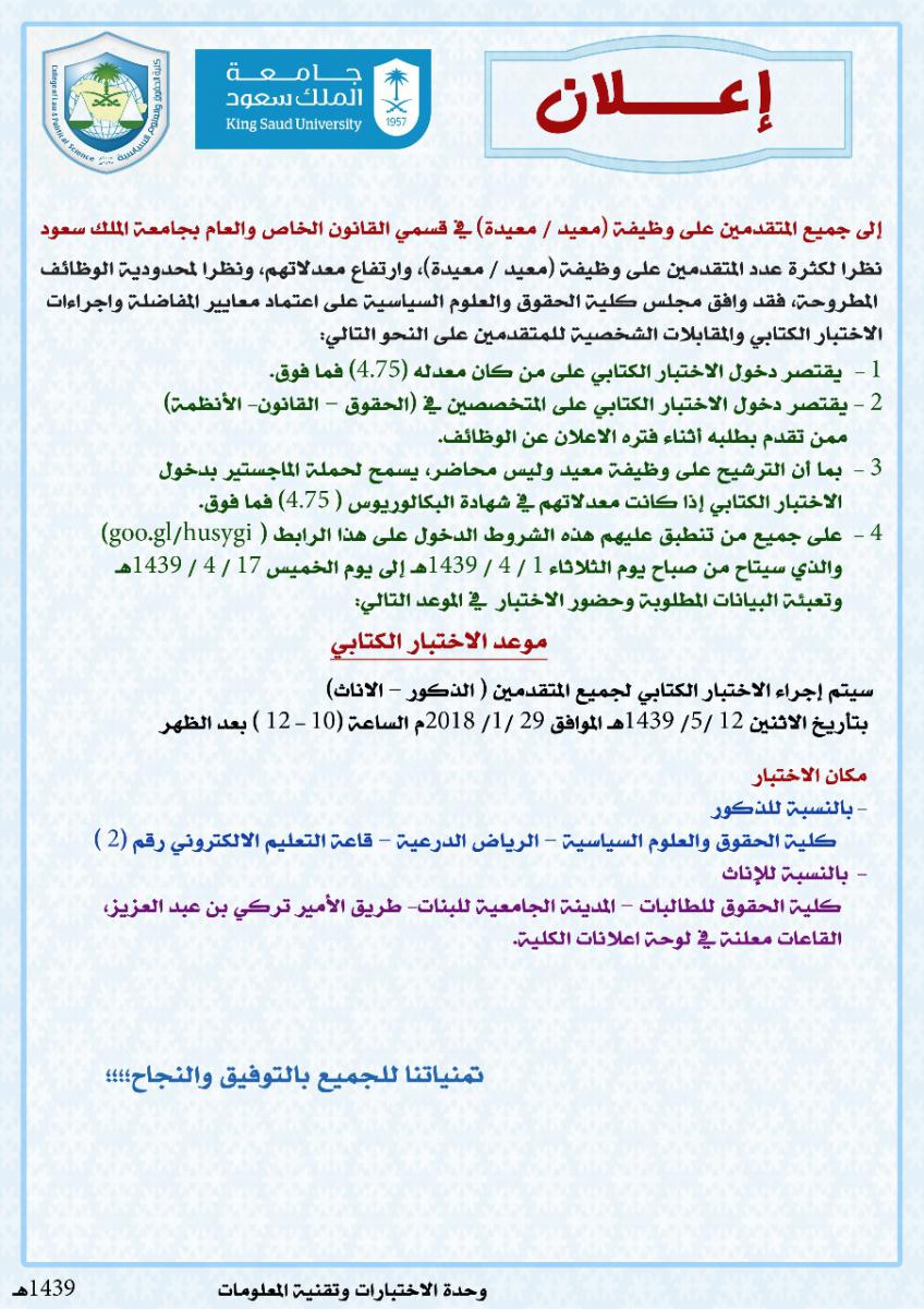 أعلنت جامعة الملك سعود عن بدء إجراءات التقديم لوظيفة معيد في كلية الحقوق والعلوم السياسية، حيث تم اعتماد معايير المفاضلة وإجراءات الاختبار الكتابي والمقابلات الشخصية للمرشحين. يمكن الاطلاع على التفاصيل من خلال الصورة المرفقة.